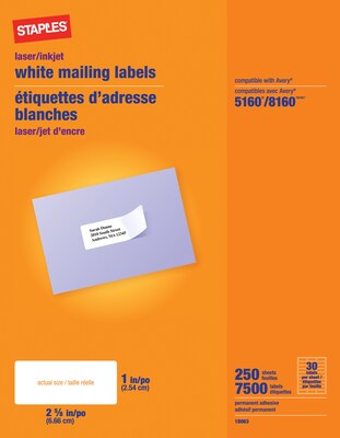 Avery Address Labels - 8160 - 30 labels per sheet Avery ® Address Labels Template. with Easy Peel ® for Inkjet Printers, 1" x 2⅝". 8160 Avery 8163 Shipping Labels, Inkjet Printers, 250 Gift Labels ... Jul 07, 2004 · This item: Avery 8163 Shipping Labels, Inkjet Printers, 250 Gift Labels, 2x4 Labels, Permanent Adhesive, TrueBlock, White $7.40 $ 7 . 40 ($0.03/Count) Get it as soon as Sunday, Nov 13 Amazon.com: Avery 5126 Shipping Address Labels, Laser ... Oct 17, 2017 · No more jams or smudges with Avery shipping labels. White labels optimized for laser printers. TrueBlock technology covers up everything underneath the shipping label so you can reuse boxes. Great for bulk shipping and mailing, organizing boxes, bin labels, classroom organization & stickers, filing & organizing, and wine labels.